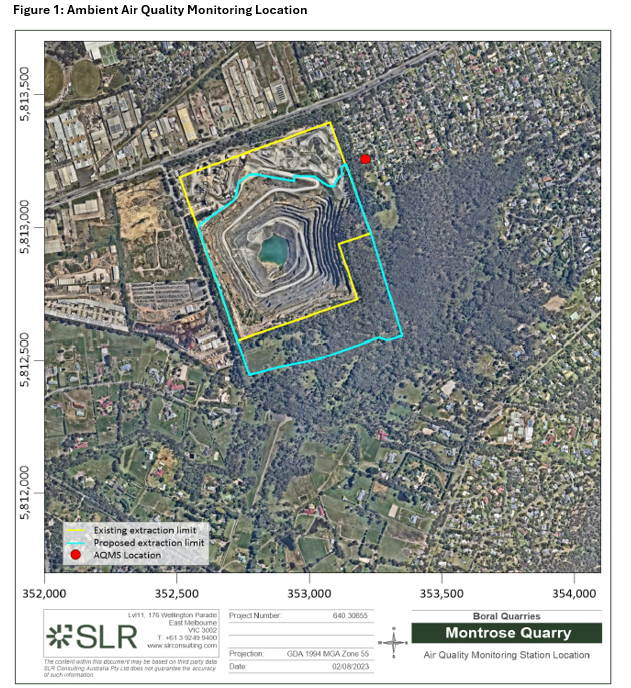 To inform this assessment, Boral undertook 12 months of ambient air quality monitoring (PM10, PM2.5 and RCS) to establish appropriate background concentrations with which to predict cumulative (Project plus background) concentrations. The location of the ambient air quality monitoring station is detailed in figure 1 below.