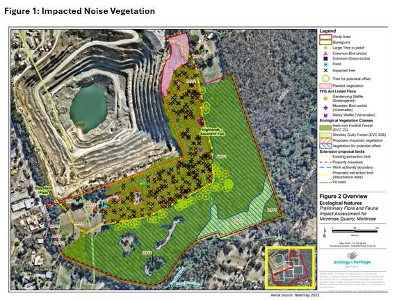 The native vegetation impacted by the project is shown in Figure 1, and is based on the proposed extraction limit boundary extension area and the outer edge of the tree canopy that just falls outside this boundary