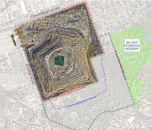 The current quarry operation occupies approximately 50.2 Ha out of Boral’s 82.5 Ha landholding and supplies concrete aggregates for projects across the greater metropolitan Melbourne area. The extension of the Pit to the East and South aims to increase the amount of resource that can be extracted within the current WA100 limit.